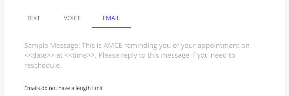 Example template: our software provides an example for an appointment confirmation text message and for an email reminder messages. You can use this example, customize the example, or fully create your own confirmation message and save it for future use.